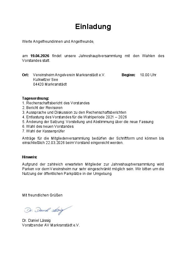 am 19.04.2026 findet unsere Jahreshauptversammlung mit den Wahlen des Vorstandes statt.